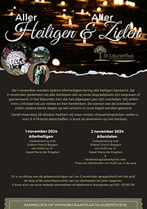 Op zaterdag 2 november gedenken wij alle dierbaren die op de St. Laurentius-begraafplaats zijn begraven of gecremeerd. Wij willen met u stilstaan bij uw verlies en hen gedenken. de namen van de overledenen worden op 1 en 2 november op een scherm in de kapel van de begraafplaats getoond en genoemd. Om 14.00 uur gaat diaken Franck Baggen voor in een gebedsviering en aansluitend zal hij het graf, de terp of het columbarium van uw dierbare zegenen.
