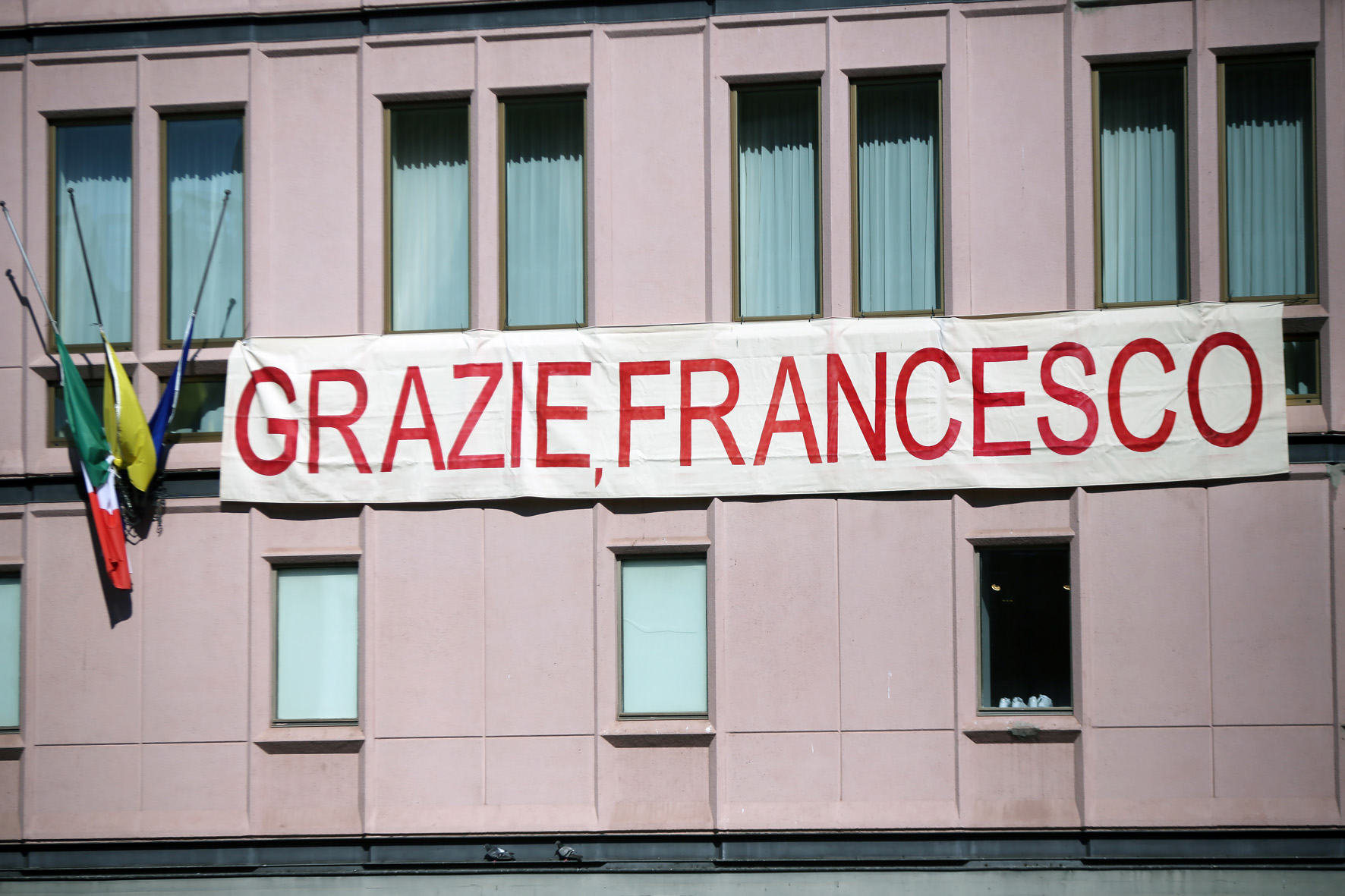 Aan het einde van de mis bezochten de Nederlandse bisschoppen gezamenlijk het graf van paus Franciscus om hem met een diepe buiging en gebed te gedenken. Bij het verlaten van de basiliek viel het oog van de pelgrims direct op een spandoek, dat bewoners van het huizenblok tegenover de basiliek hebben opgehangen, met de tekst: ‘Grazie, Francesco – Franciscus bedankt’.